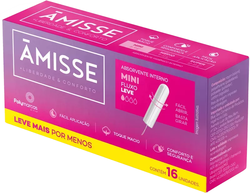 Tamanho mini: Design compacto e menor, ideal para quem está começando a usar absorventes internos ou para dias de pouco fluxo.