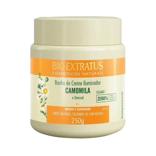 O Banho de Creme Bio Extratus Camomila e Girassol 250g é um tratamento capilar que oferece hidratação intensa, clareamento natural e luminosidade aos fios. Sua fórmula combina camomila, conhecida por suas propriedades clareadoras, e girassol, rico em vitamina E, que nutre e protege os cabelos.