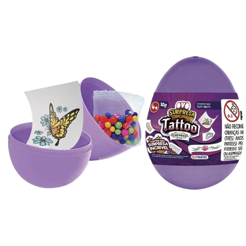 O Ovo Surpresa Tattoo Menina é uma guloseima divertida que combina confeitos saborosos com uma surpresa especial: tatuagens sortidas e coloridas! Cada ovo contém tatuagens de diferentes tamanhos e estampas, além de confeitos com sabor de tutti-frutti, tornando-o uma escolha encantadora para crianças.