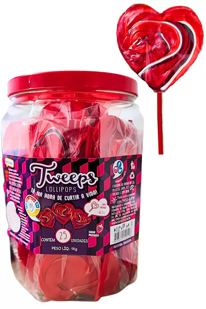 O Pirulito Tweeps Coração é uma guloseima charmosa e deliciosa, ideal para presentear ou usar em festas temáticas. Ele encanta pelo formato romântico de coração e é perfeito para sacolinhas de aniversário, lembrancinhas ou para adoçar momentos especiais de forma única e carinhosa.